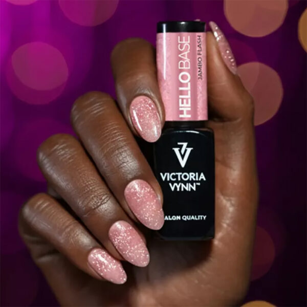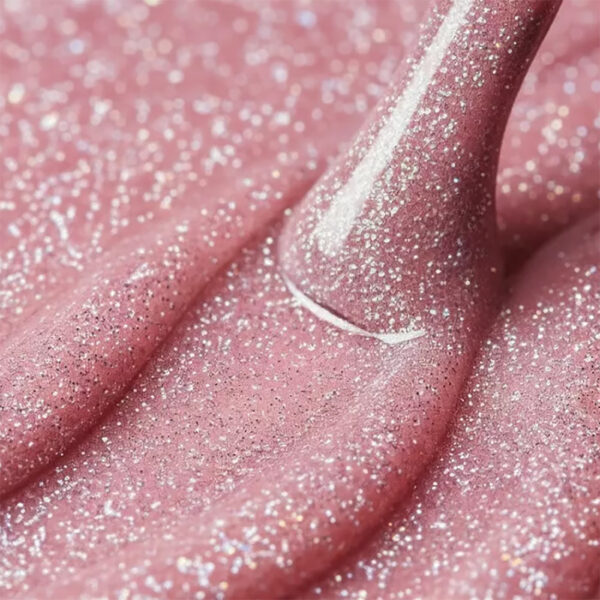 Base híbrida em gel com efeito flash espetacular e partículas tipo pó de diamante incorporadas num delicado tom rosa semitransparente.